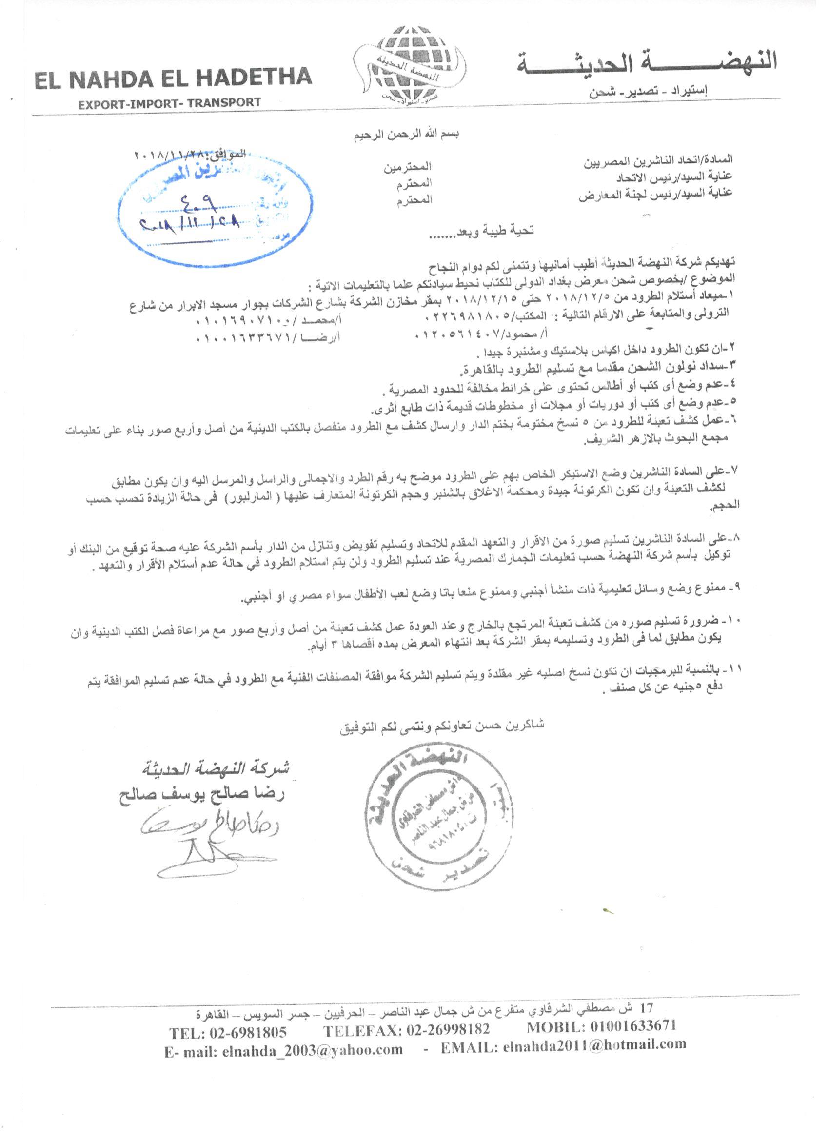 بخصوص تعليمات شحن معرض بغداد الدولى للكتاب