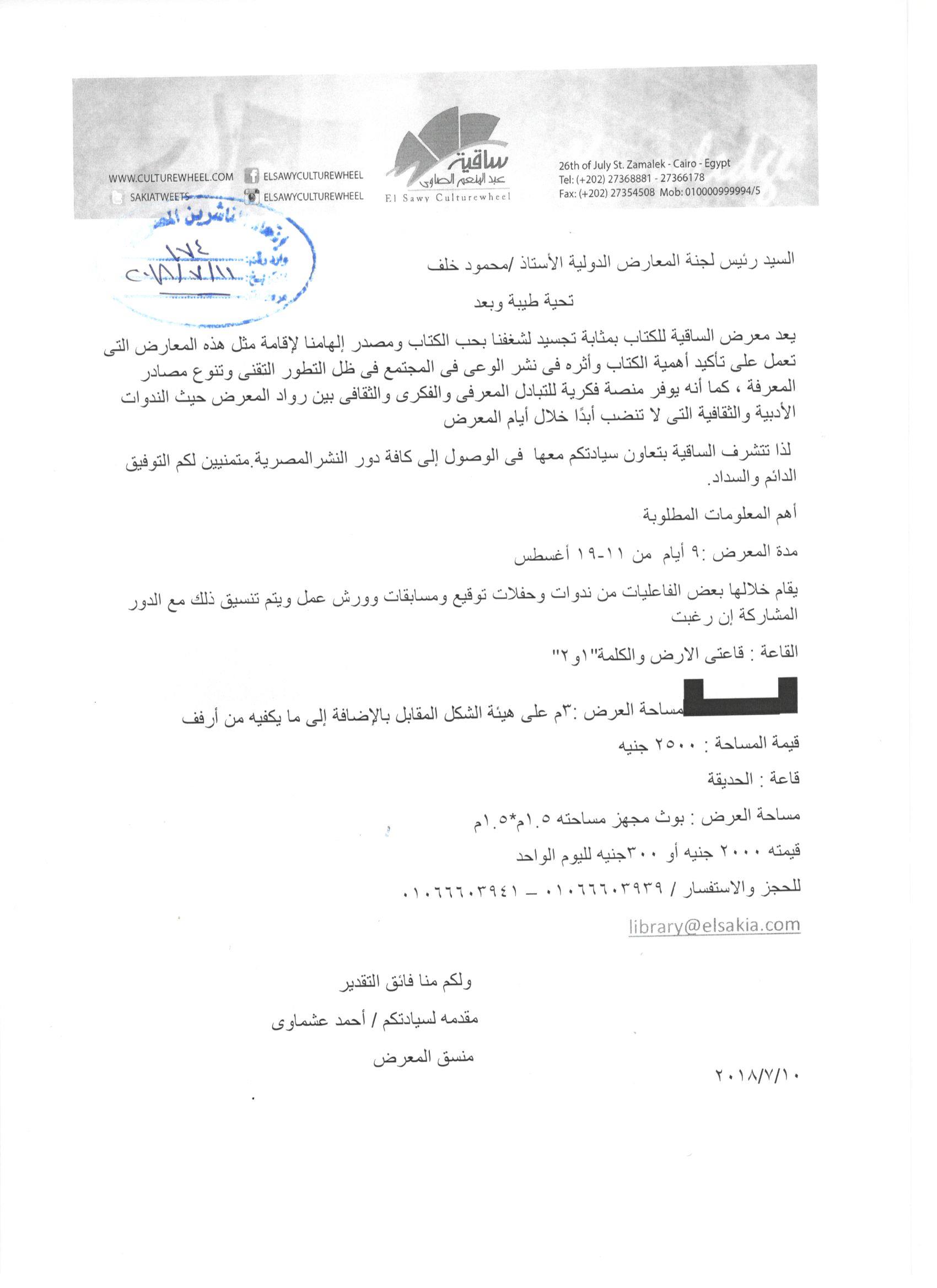 يهديكم اتحاد الناشرين المصريين أطيب تحياته؛ وخالص أمنياته؛ ونتشرف بالإحاطة بأنه ورد إلينا كتاب ساقية عبد المنعم الصاوى، بشأن دعوة المشاركة فى معرض الساقية للكتاب، والمزمع إقامته فى الفترة من 11 : 19 أغسطس (مرفق).