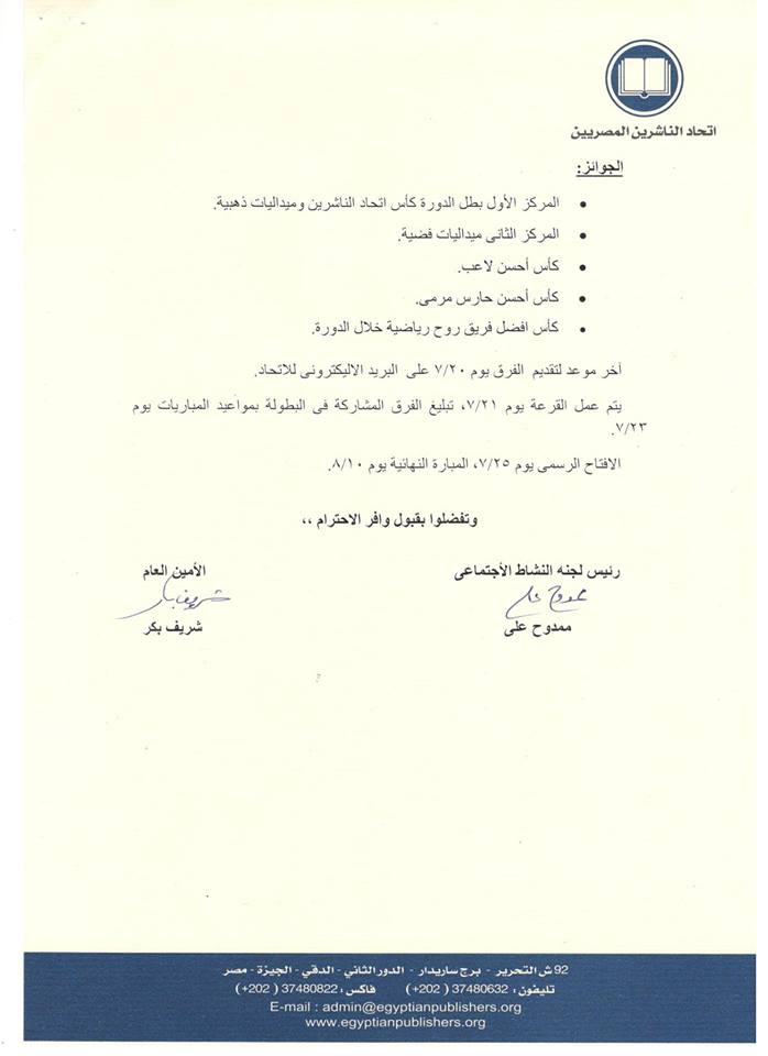 بخصوص دورة كرة القدم تحت رعاية اتحاد الناشرين المصريين