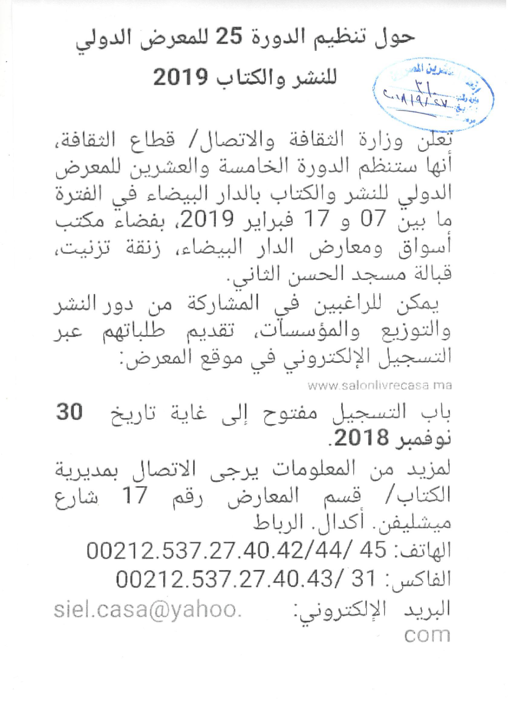 بخصوص فتح باب التسجيل للاشتراك فى معرض الدار البيضاء الدولى للكتاب