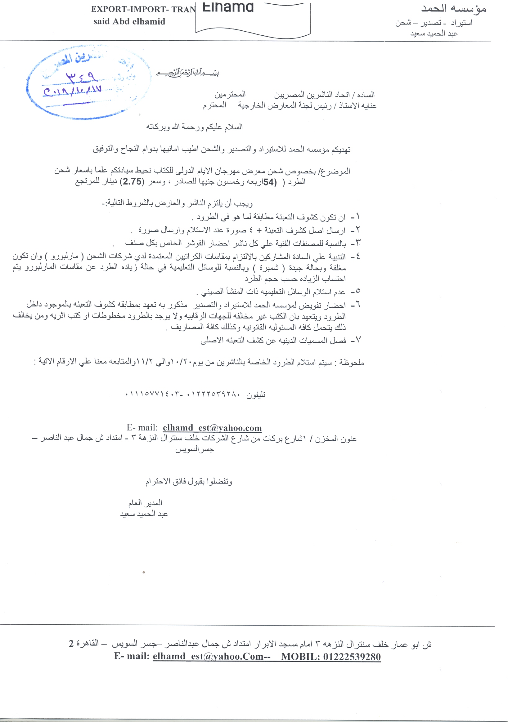 بخصوص تعليمات شحن معرض مهرجان الأيام بالبحرين